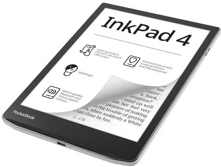 PocketBook InkPad 4 е оборудван с E Ink Carta™ 1200 екран с резолюция 1404 × 1872 пиксела и плътност 300 PPI, осигуряващ изображение с размер като на книга. Дисплеят предлага 15% по-добър контраст на електронната страница и 20% по-бърза реакция, което прави четенето по-ясно и по-бързо.