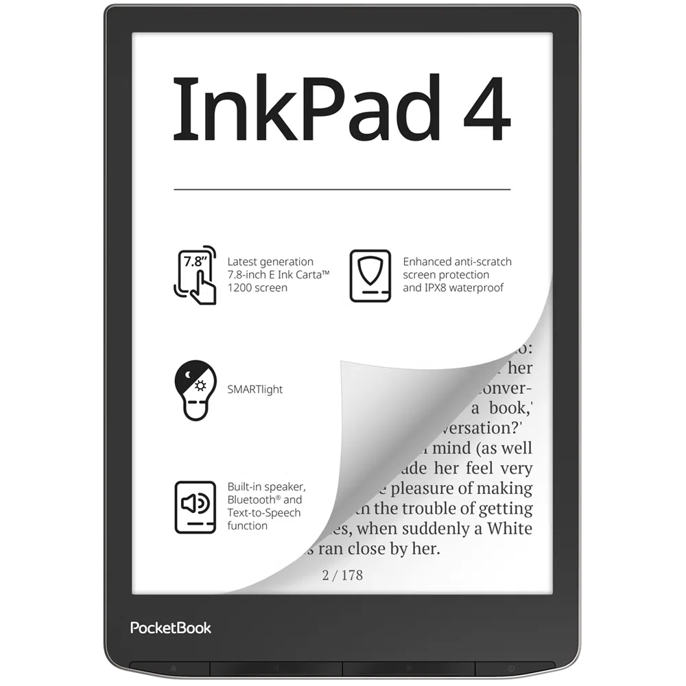 PocketBook InkPad 4 впечатлява с компактни размери и удобна ергономична форма. Черните преден и заден панел създават елегантен контраст с лунно-сребристия кант, придавайки стилен и изчистен вид.