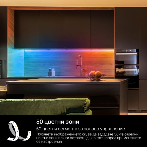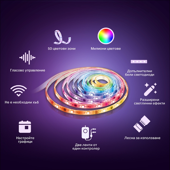 С до 50 индивидуално адресируеми цветови зони, лентата позволява фина настройка на светлината според всяко настроение или конкретен сценарий. Наличните анимирани ефекти, достъпни чрез приложението Tapo, внасят динамика и атмосфера в помещението.