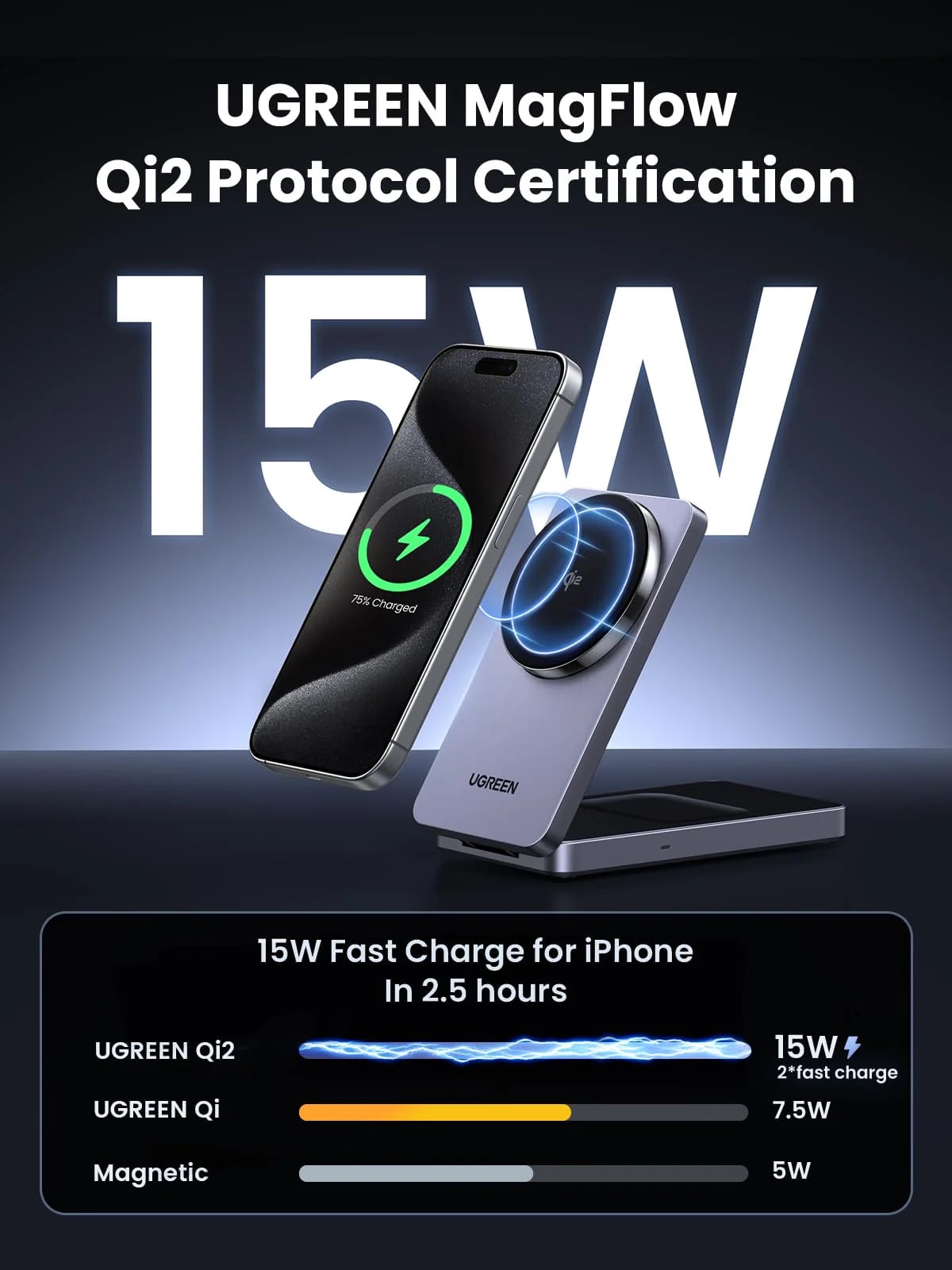 Ugreen W706 е модерно 2 в 1 безжично зарядно устройство, създадено специално за потребители на Apple екосистемата, които търсят бързо и сигурно зареждане в компактна форма. Благодарение на магнитната си конструкция и поддръжката на най-новите стандарти, моделът осигурява стабилна връзка и надеждно захранване за iPhone и безжични слушалки.