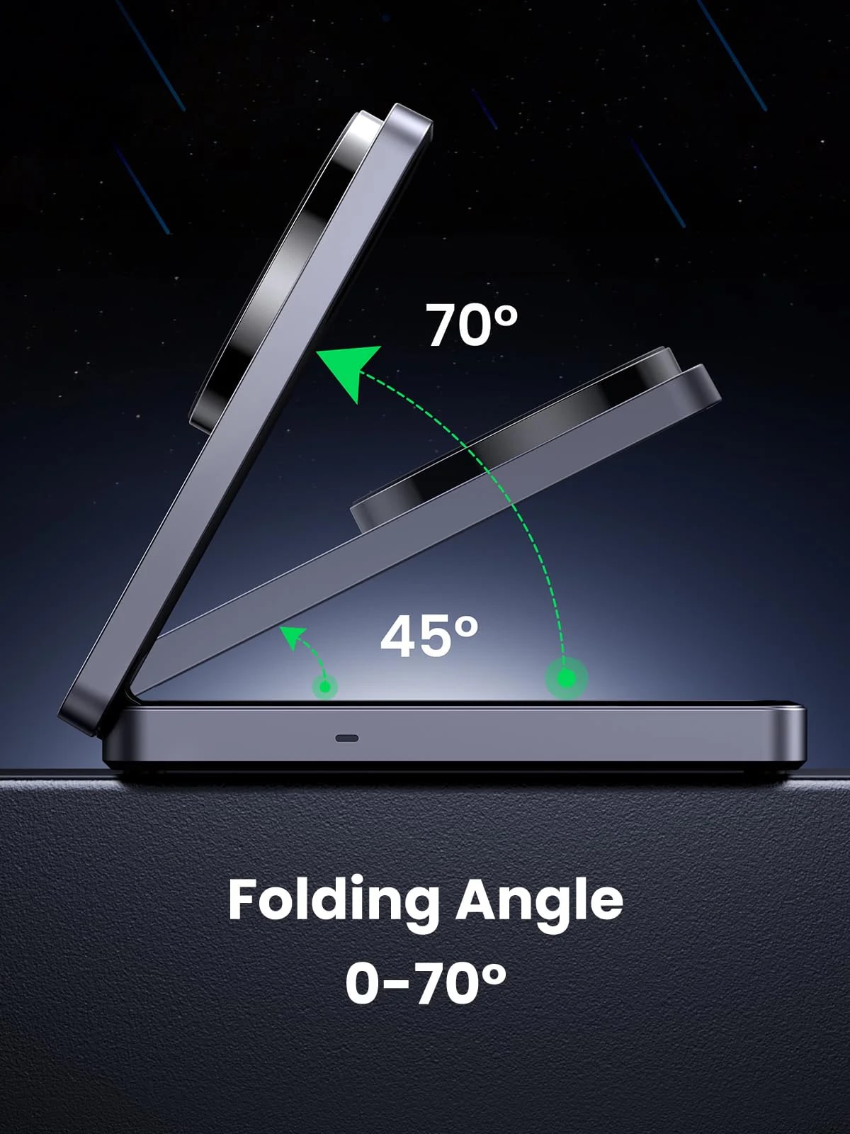 Компактният корпус и ниското тегло правят Ugreen W706 удобен за пренасяне и подходящ за използване у дома, в офиса или по време на пътуване. Регулируемият ъгъл до 70 градуса позволява комфортно гледане на съдържание или видео разговори, без да се спира зареждането.