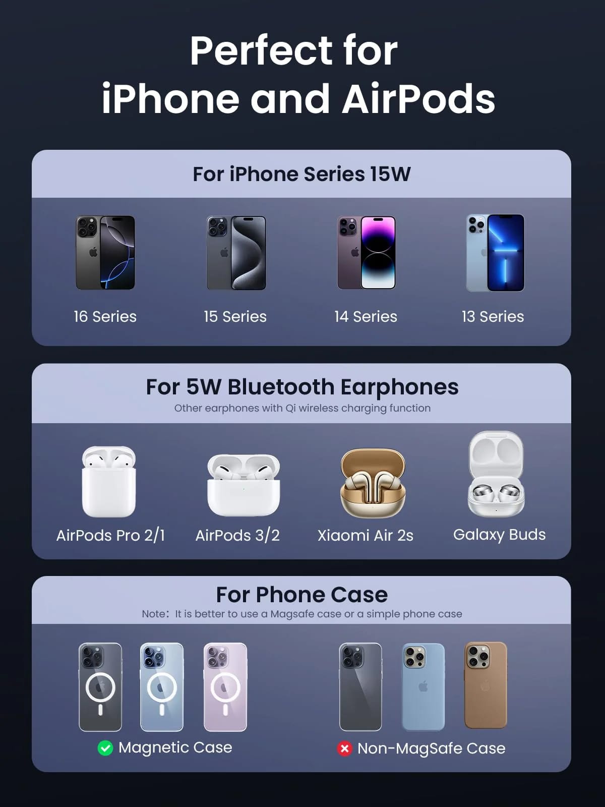 Зарядното поддържа Qi2 сертифицирано безжично зареждане с мощност до 15W за съвместими iPhone модели от сериите 12 до 16. За слушалки като AirPods се осигурява оптимална мощност до 5W, което позволява едновременно и балансирано зареждане на двете устройства.
