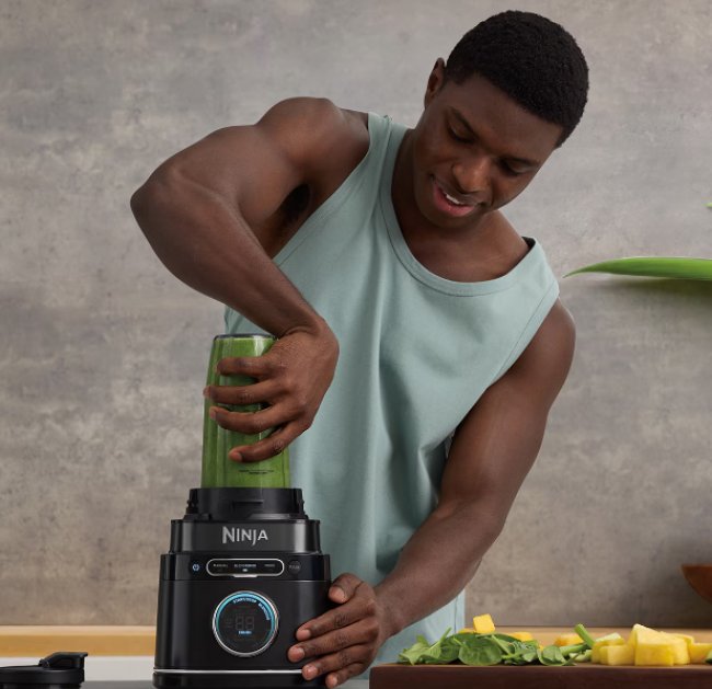 Блендерът Ninja Detect Power Pro TB301EU с мощност 1200 W автоматично разпознава съставките и регулира настройките за перфектно смесване. Разполага с 2,1 л капацитет, 15 функции и включени чаши от 700 мл за индивидуални порции.