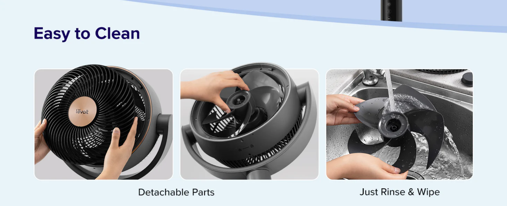 Levoit Circulator Fan разполага с безчетков DC мотор, който осигурява изключително тиха работа – само 20 децибела. Това го прави идеален избор за спалня или всяко помещение, където тишината е приоритет. Шепотът на въздуха създава усещане за спокойствие, напомнящо разходка сред природата.