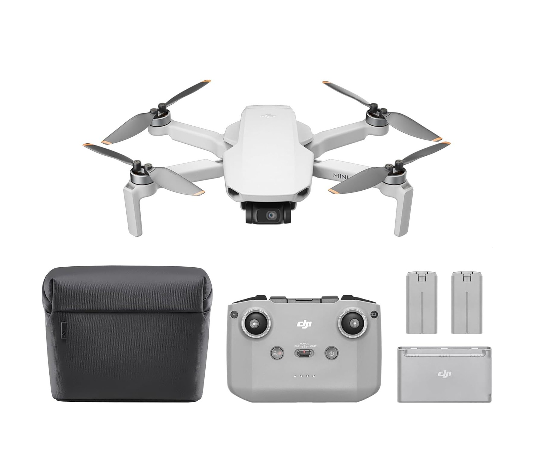 Включва дрон, RC-N1C дистанционно, 3 батерии DJI Mini 2, чанта, зарядно хъб, кабели USB-C/Lightning/микро-USB, витла, защитен калъф и отвертка. Fly More Combo гарантира продължителни сесии и удобен транспорт. Подходящ за семейни моменти и пейзажи.