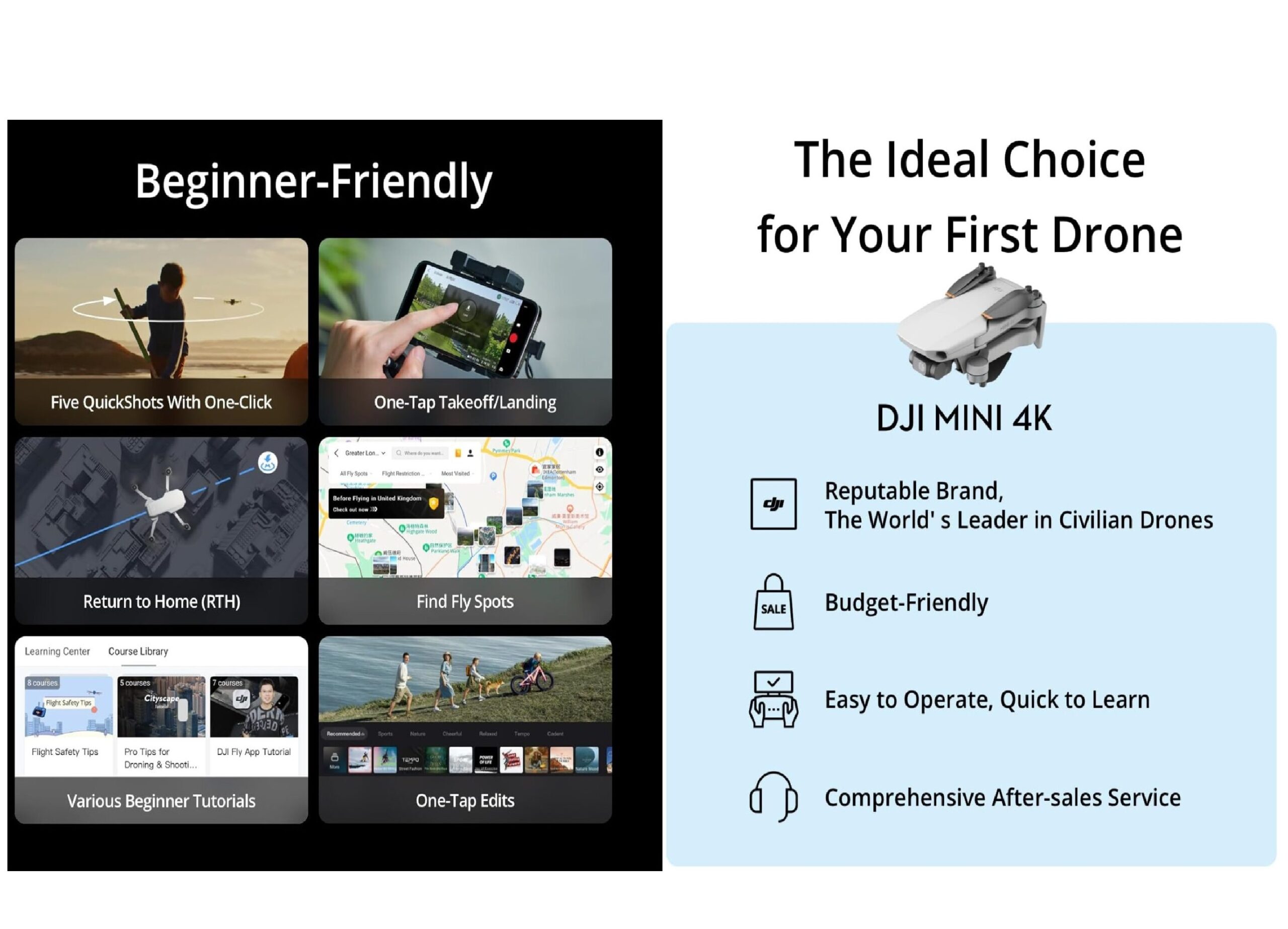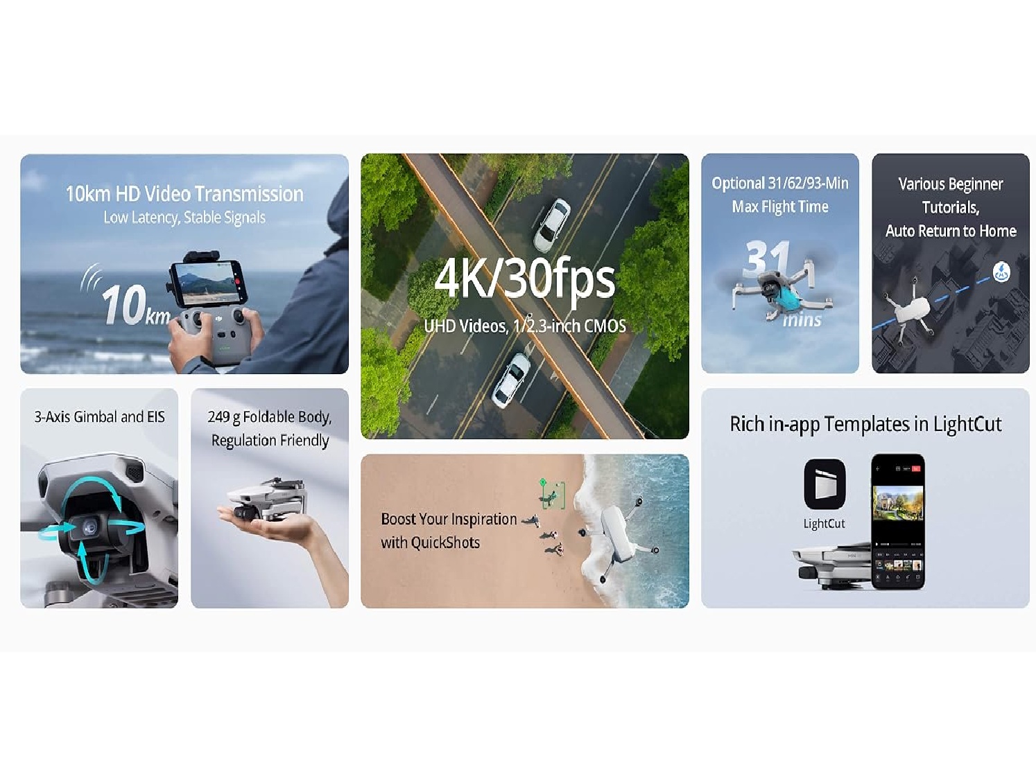 DJI Mini 4K тежи само 249 грама и предлага 4K Ultra HD качество чрез 1/2.3-инчова CMOS камера с 3-осова механична стабилизация. Захваща реалистични цветове при всякакво осветление, от изгреви до нощни сцени, с QuickShots режими като Helix и Boomerang. Идеален за начинаещи с едно-докосване излитане, GPS връщане и лесно обучение чрез приложението.