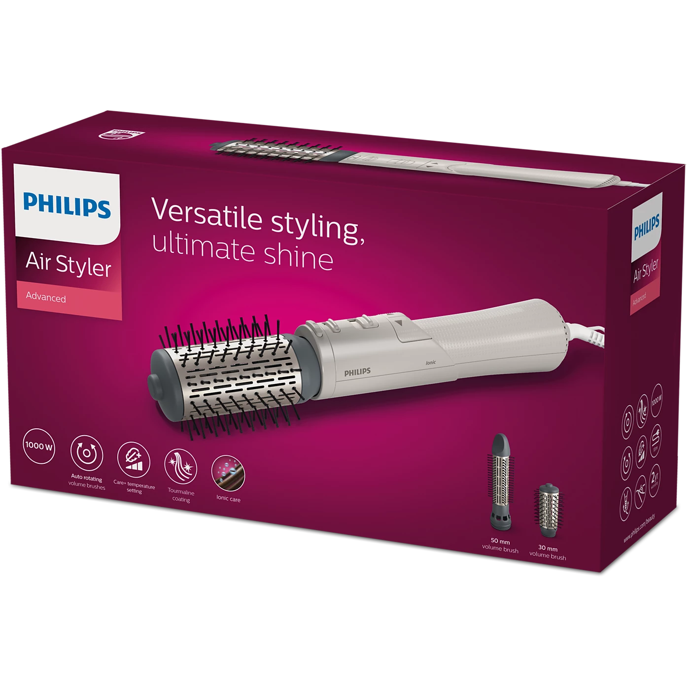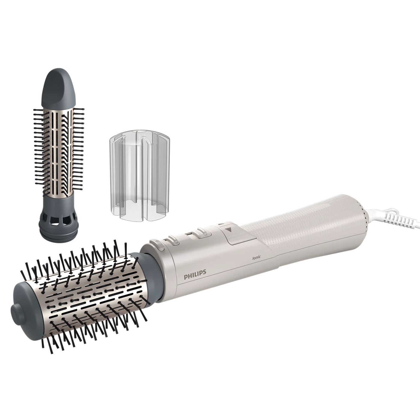 Електрическата четка Philips 7000 Series Air Styler с мощност 1000 W съчетава сушене и оформяне, за да постигнете професионални резултати у дома. Създадена за гладка, обемна и бляскава коса, тя е снабдена с две въртящи се приставки и технология, която се грижи за здравината на косъма по време на оформяне.