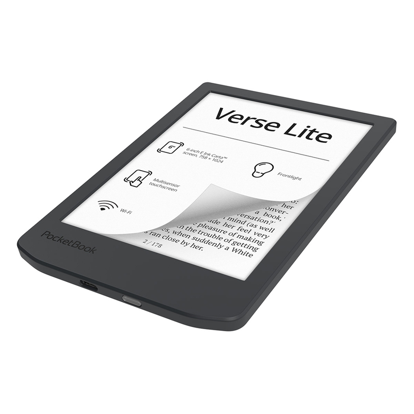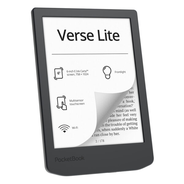 Електронният четец PocketBook Verse Lite разполага с 6-инчов E Ink Carta™ сензорен екран, който наподобява текстурата на хартия и не натоварва очите дори при продължително четене. Вградената предна подсветка позволява комфортно ползване при всякаква светлина – както на ярко слънце, така и в тъмна стая.