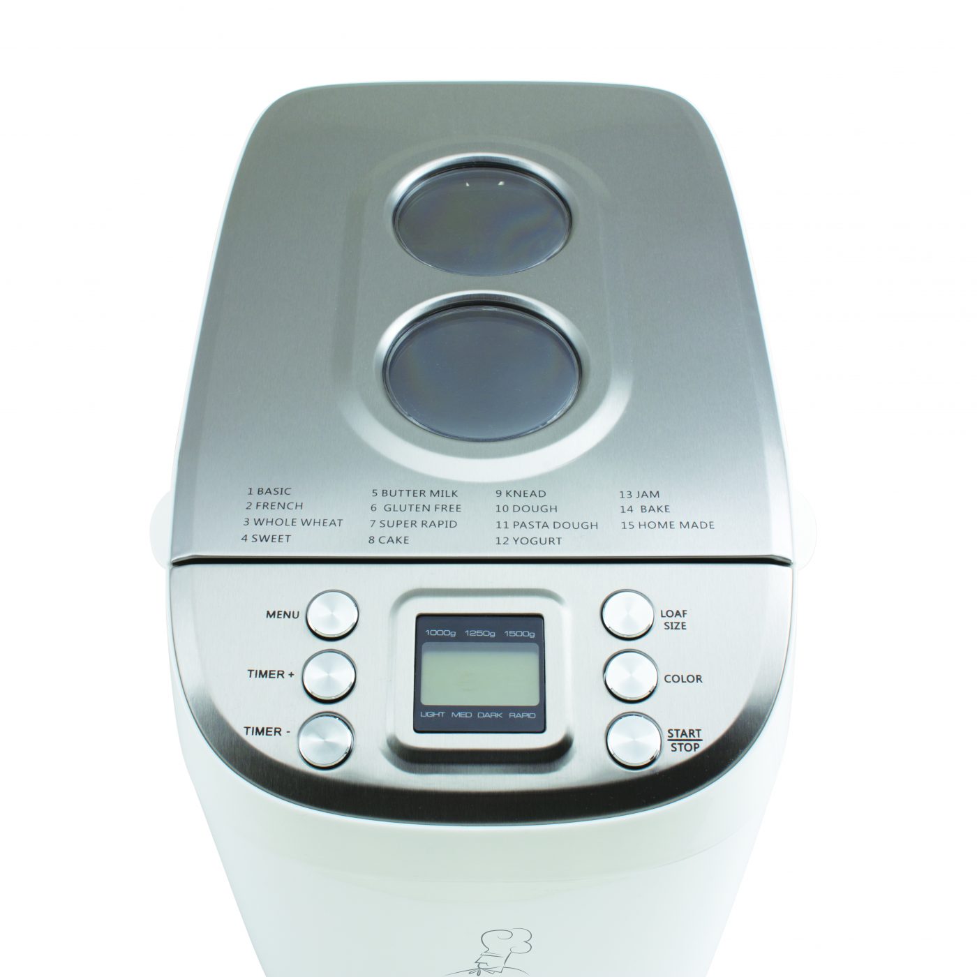 Устройството е оборудвано с LCD дисплей и голям прозорец за наблюдение по време на работа. Функцията за отложен старт до 15 часа позволява предварително планиране, а поддържането на температурата до 60 минути запазва хляба топъл и ароматен след изпичане.