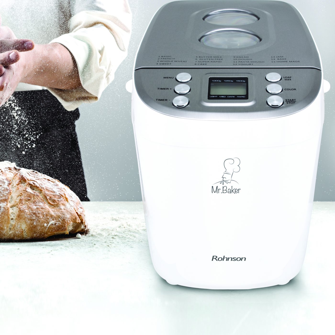 Капацитетът от 1000 до 1500 грама е идеален за цялото семейство. Съдът за печене и двете бъркалки са с незалепващо покритие, което осигурява лесно почистване и равномерно месене.