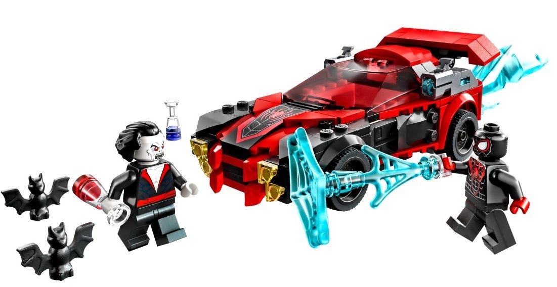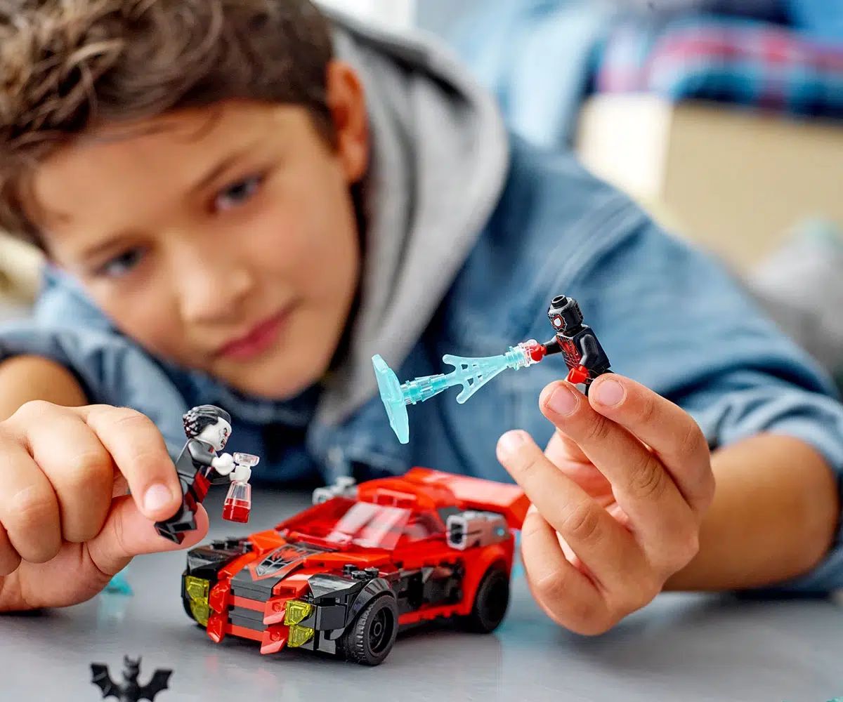 Един от акцентите в комплекта е състезателната кола на Майлс Моралес, която е създадена за динамична игра и впечатляващ външен вид. Моделът е оборудван с усилващ елемент в задната част, който подчертава спортното излъчване и допринася за още по-завладяващо игрово изживяване.