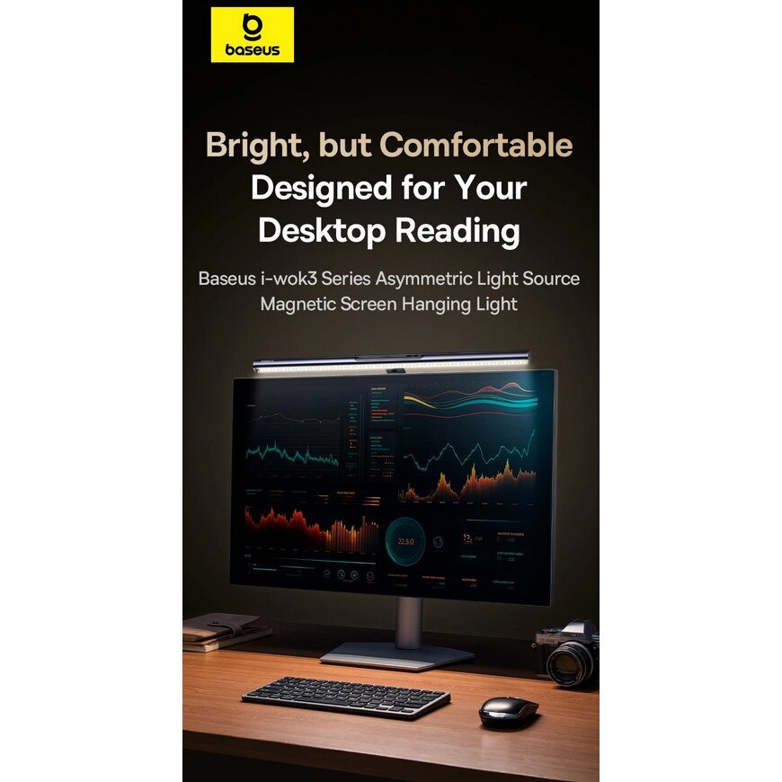 Baseus i-Wok 3 е магнитна LED лампа за монитор с асиметричен дизайн, която намалява отблясъците и предпазва очите. Предлага тъч управление, памет на режима и лесен монтаж върху плоски и извити екрани.