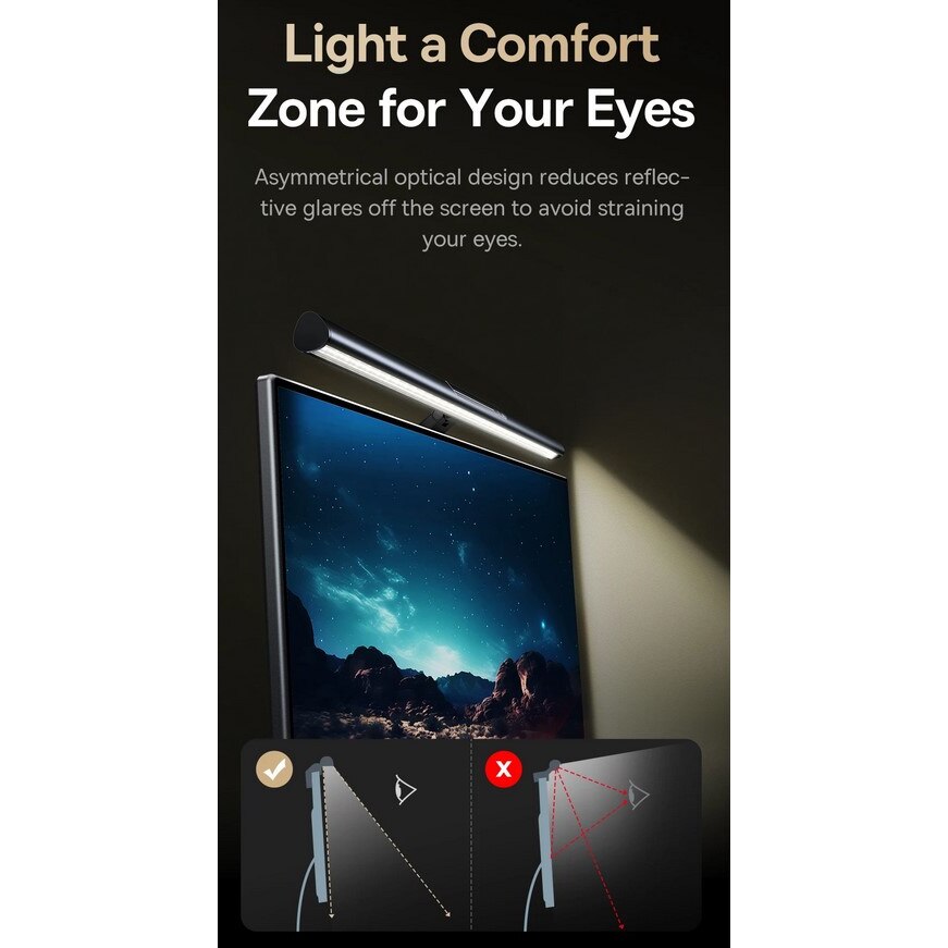 Baseus i-Wok 3 е LED лампа за монитор с асиметричен оптичен дизайн, който насочва светлината така, че да намали отблясъците от екрана и да щади очите при продължителна работа. Благодарение на магнитната си конструкция, лампата се монтира лесно върху различни видове монитори – както плоски, така и извити. Възможността за завъртане на корпуса до 270° осигурява гъвкавост при настройката на осветлението.