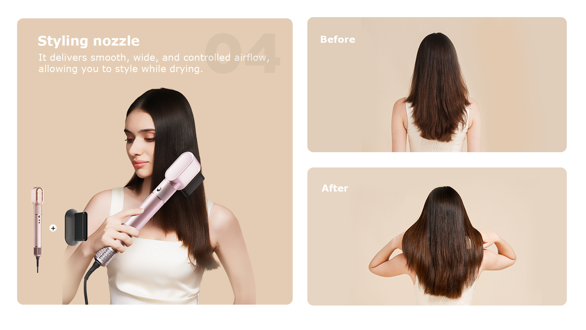 Специалната styling nozzle приставка насочва въздушния поток по-плавно и контролирано, което е особено полезно при работа с четка и оформяне на по-детайлни участъци. Това дава повече точност и улеснява създаването на по-изчистен краен резултат.
