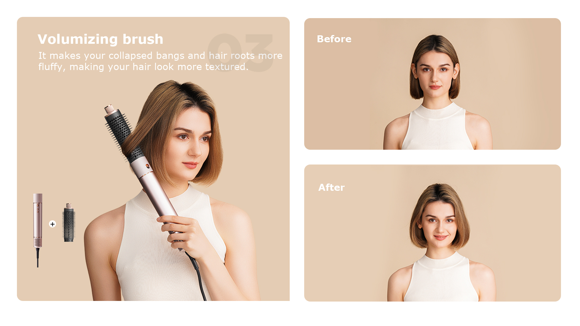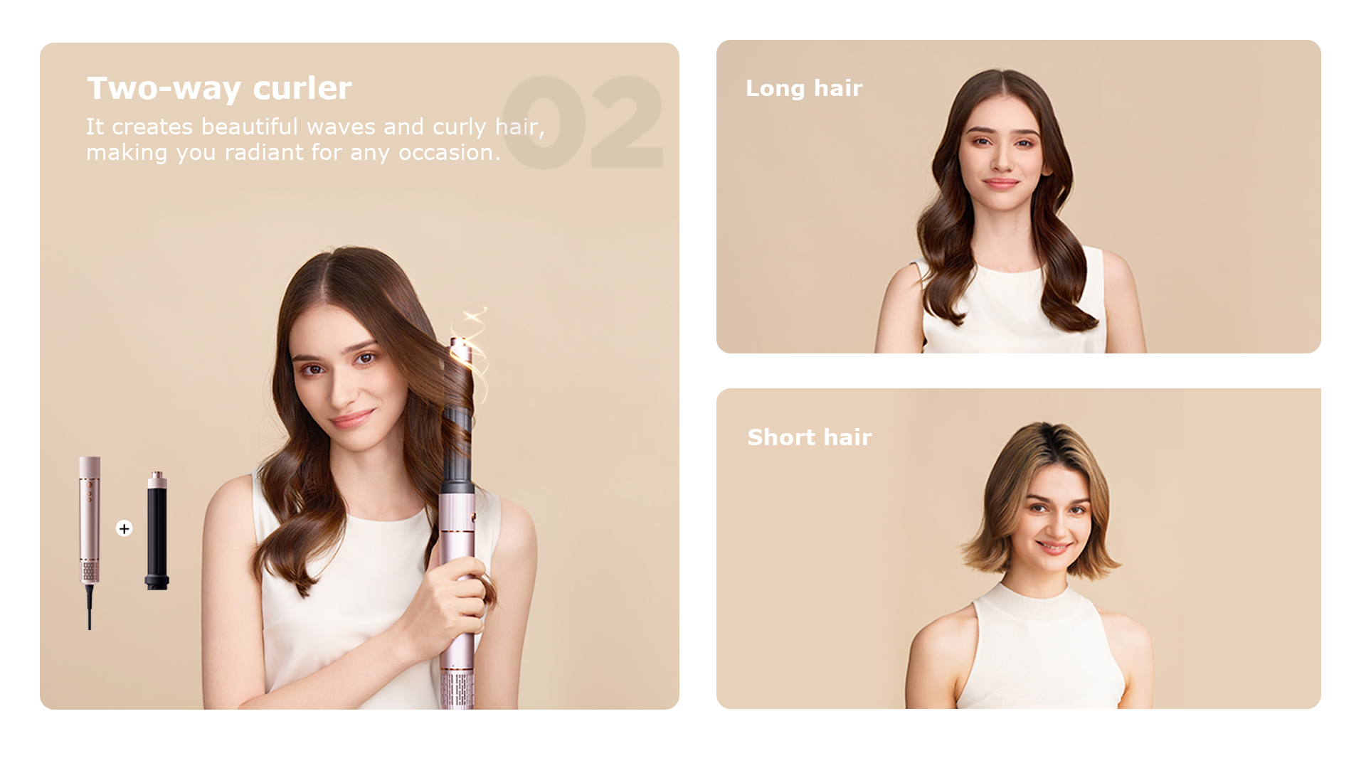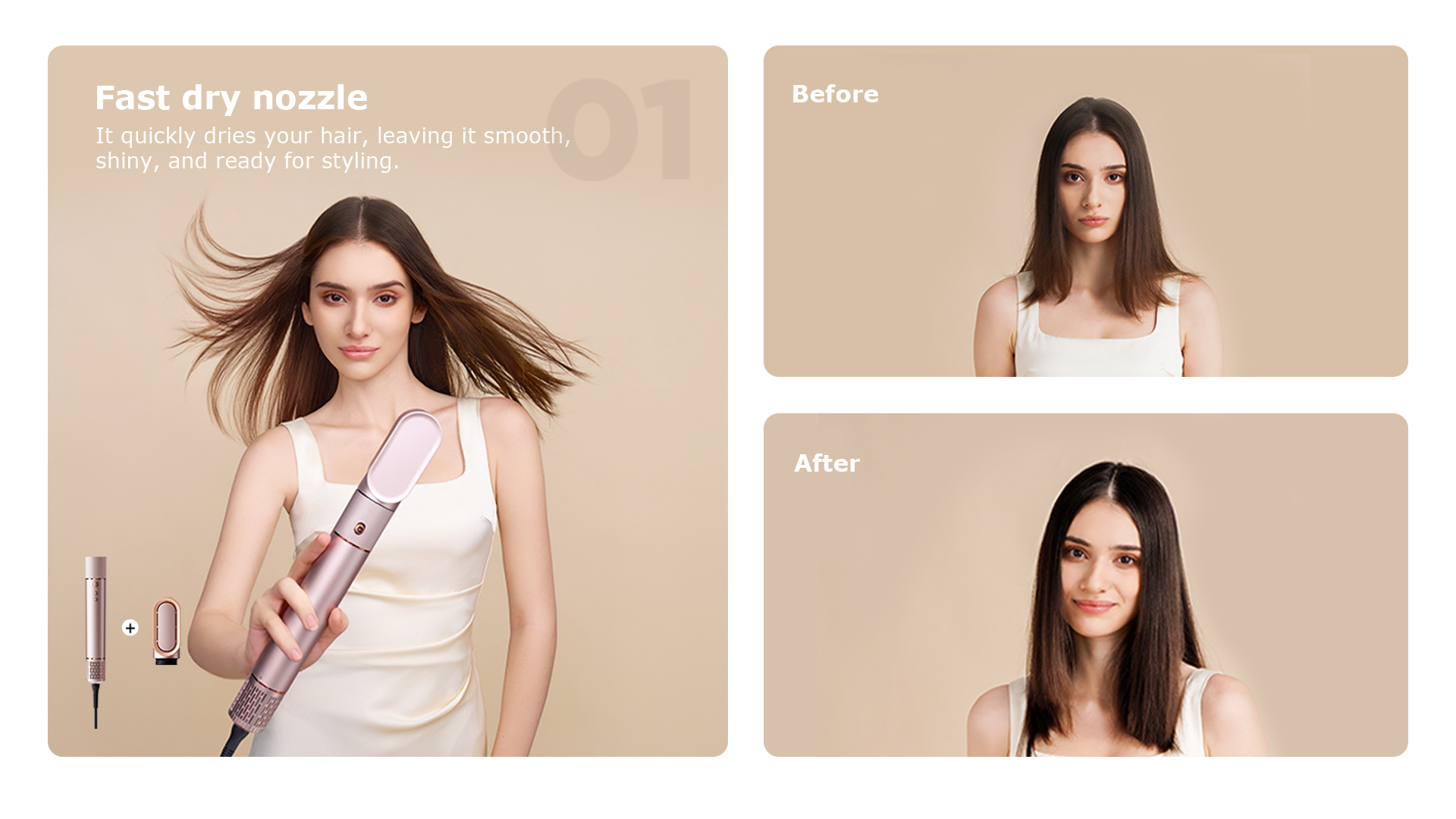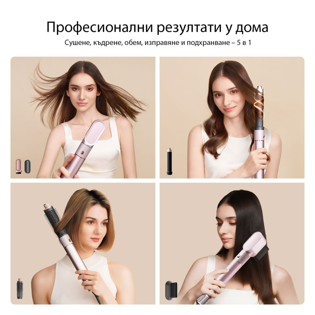 Моделът предлага практичен набор от аксесоари, с които можете лесно да сменяте стила според повода и предпочитанията си. Приставката за бързо сушене е подходяща за ежедневна употреба, двупосочният накрайник за къдрици улеснява създаването на вълни и къдрици, а четката за обем е отличен избор за повече плътност в корените и по-добро оформяне на бретон.