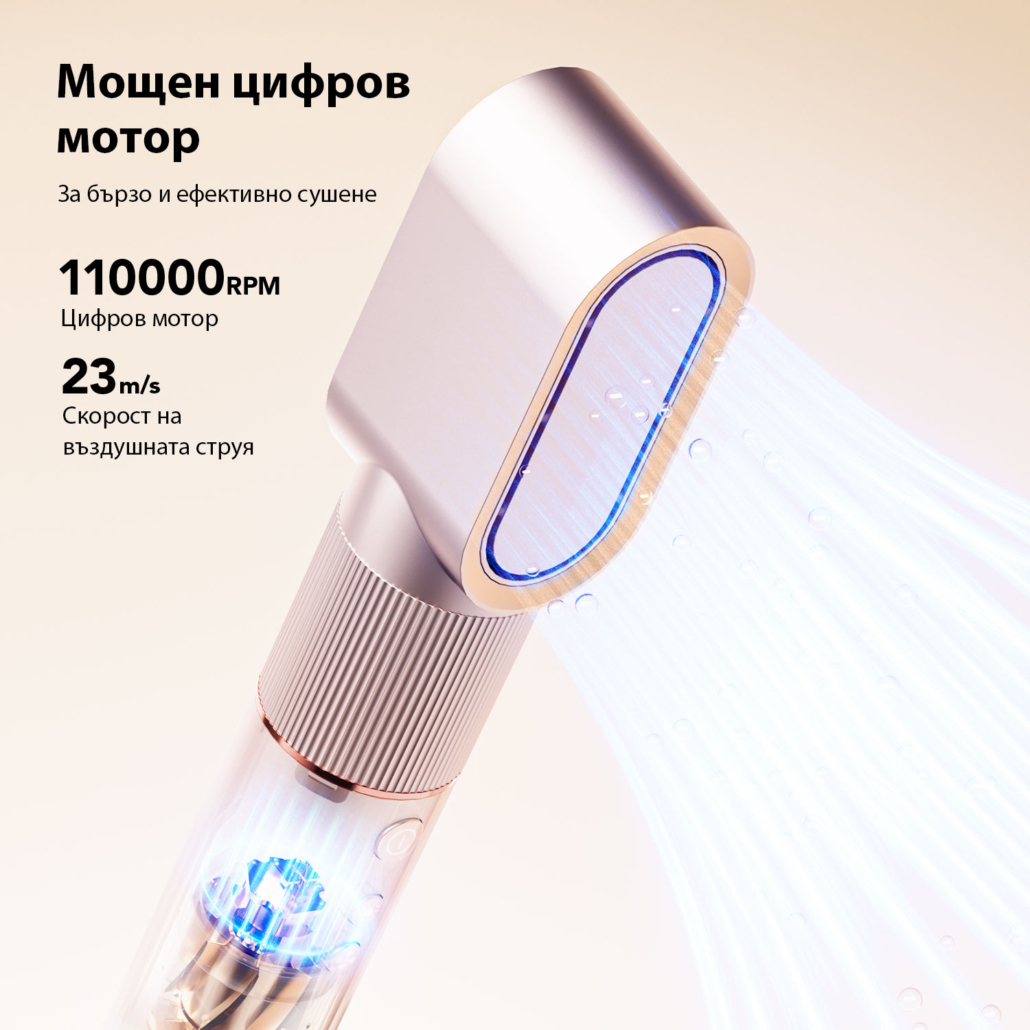 Моделът е оборудван с дигитален мотор, който достига 110 000 оборота в минута и създава силен въздушен поток до 23 m/s. Това позволява по-бързо изсушаване на косата и по-добра подготовка за оформяне, като същевременно уредът остава подходящ за честа употреба.