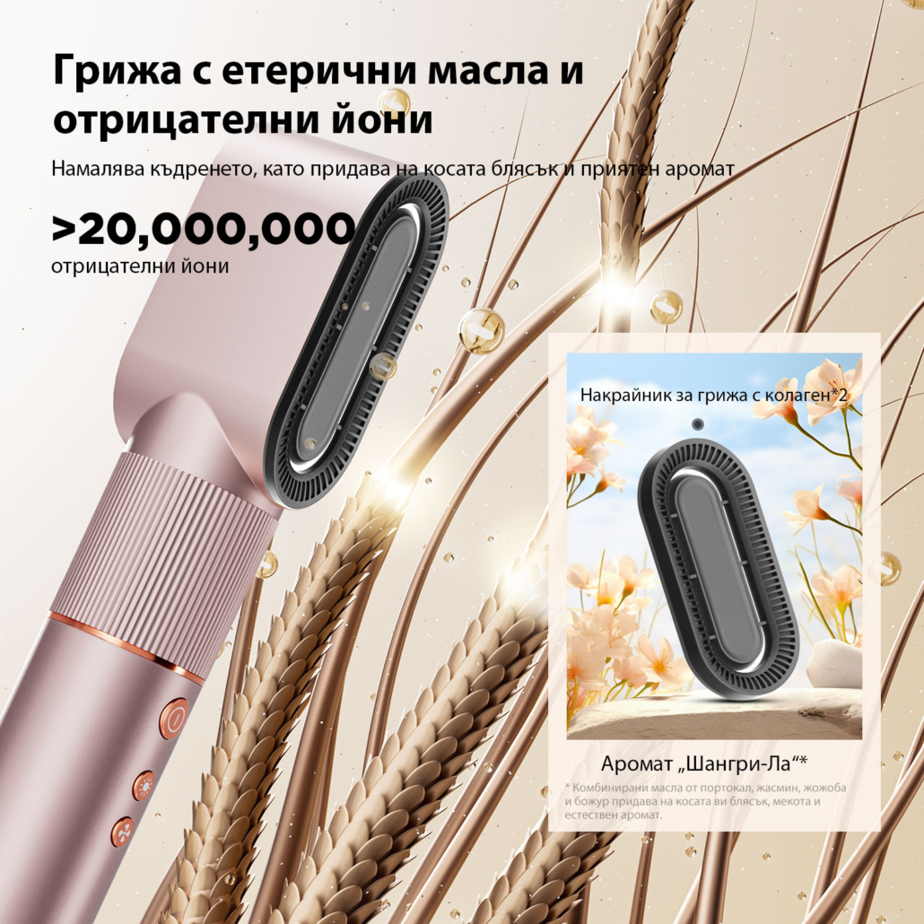 Една от отличителните функции на HF9 Pro е collagen care системата, която допринася за по-добър външен вид и усещане на косата. Специалните дюзи за колаген грижа работят заедно с приставката за сушене и подпомагат по-мекото и по-гладко оформление по време на използване.