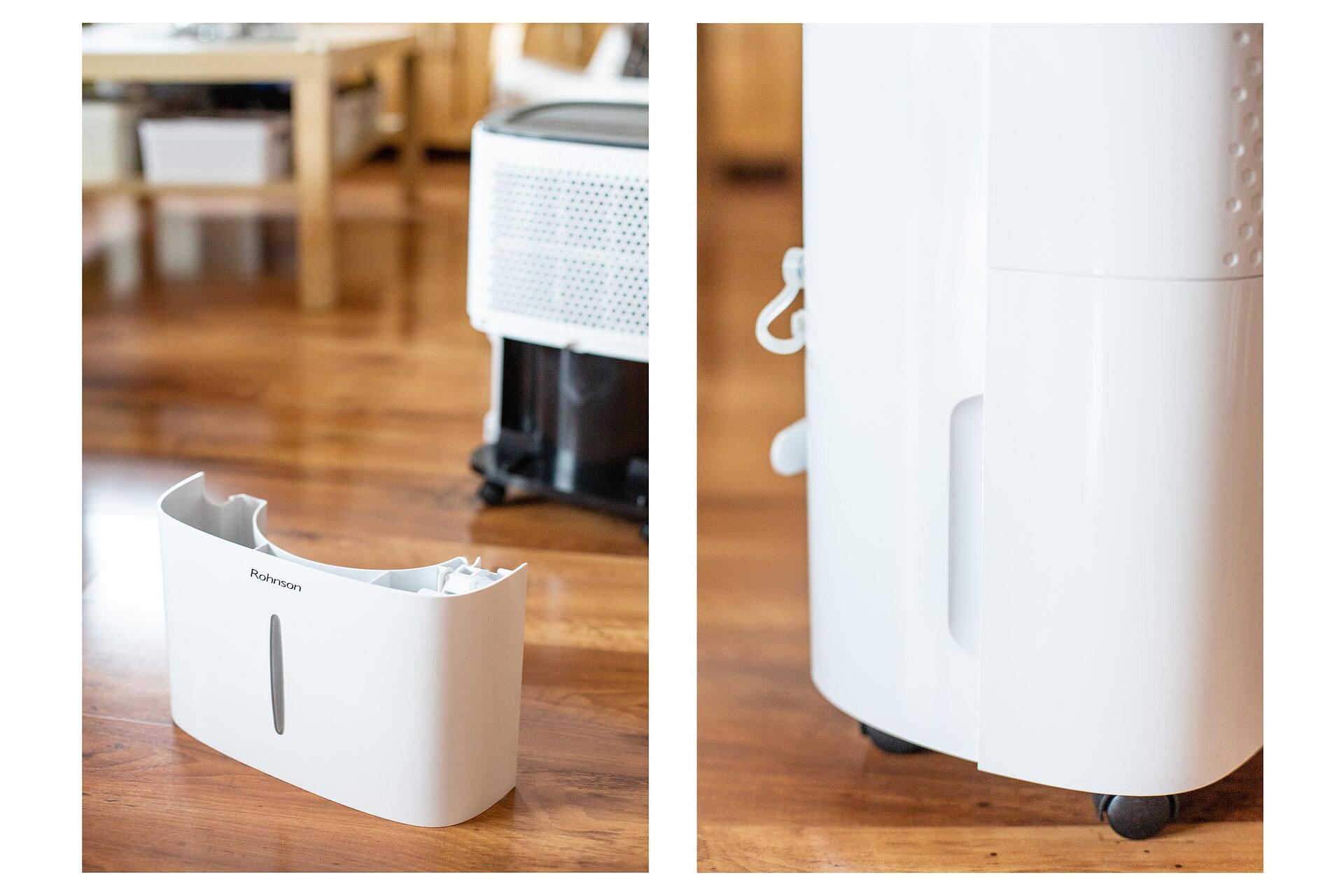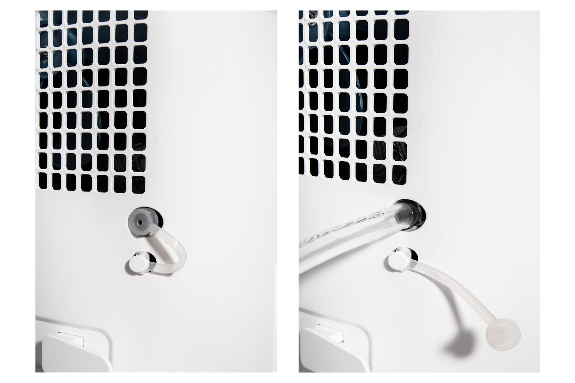 Уредът е снабден с индикатор за пълен резервоар и автоматично изключване при напълване, което осигурява допълнителна сигурност и удобство при употреба. Възможността за постоянен дренаж улеснява продължителната работа, а противозамръзващата функция позволява по-стабилна работа при по-ниски температури в диапазона от 5°C до 32°C.