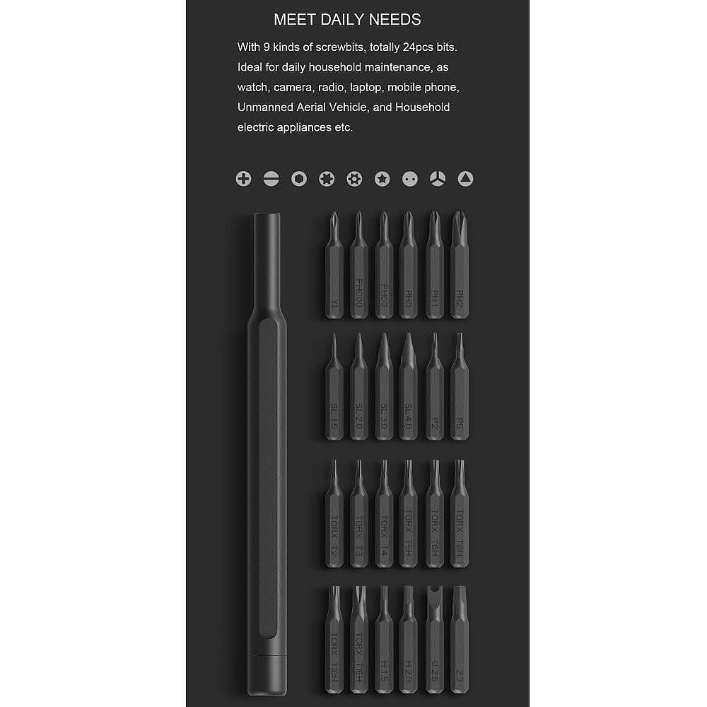 Комплектът прецизни отвертки Mi е създаден с оптимизиран минималистичен дизайн, който покрива всички ежедневни нужди при сглобяване и ремонт. Той съдържа 24 висококачествени прецизни бита, подходящи за широка гама от електроника, домакински уреди и битови продукти.