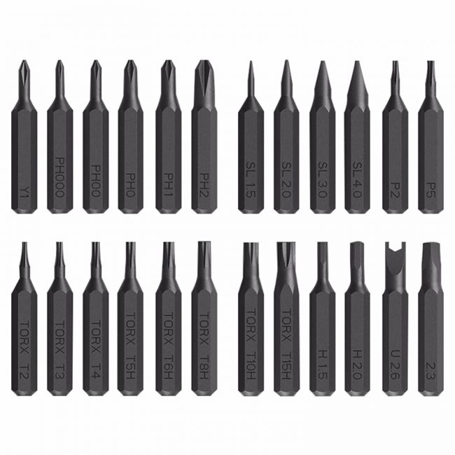 Прецизните бита са адаптирани спрямо съвременната масова електроника, което повишава използваемостта и прави разглобяването и ремонта по-бързи и лесни. Всеки от тях е изработен от S2 легирана стомана с твърдост до 60 HRC, осигурявайки дълъг живот и устойчивост на износване.