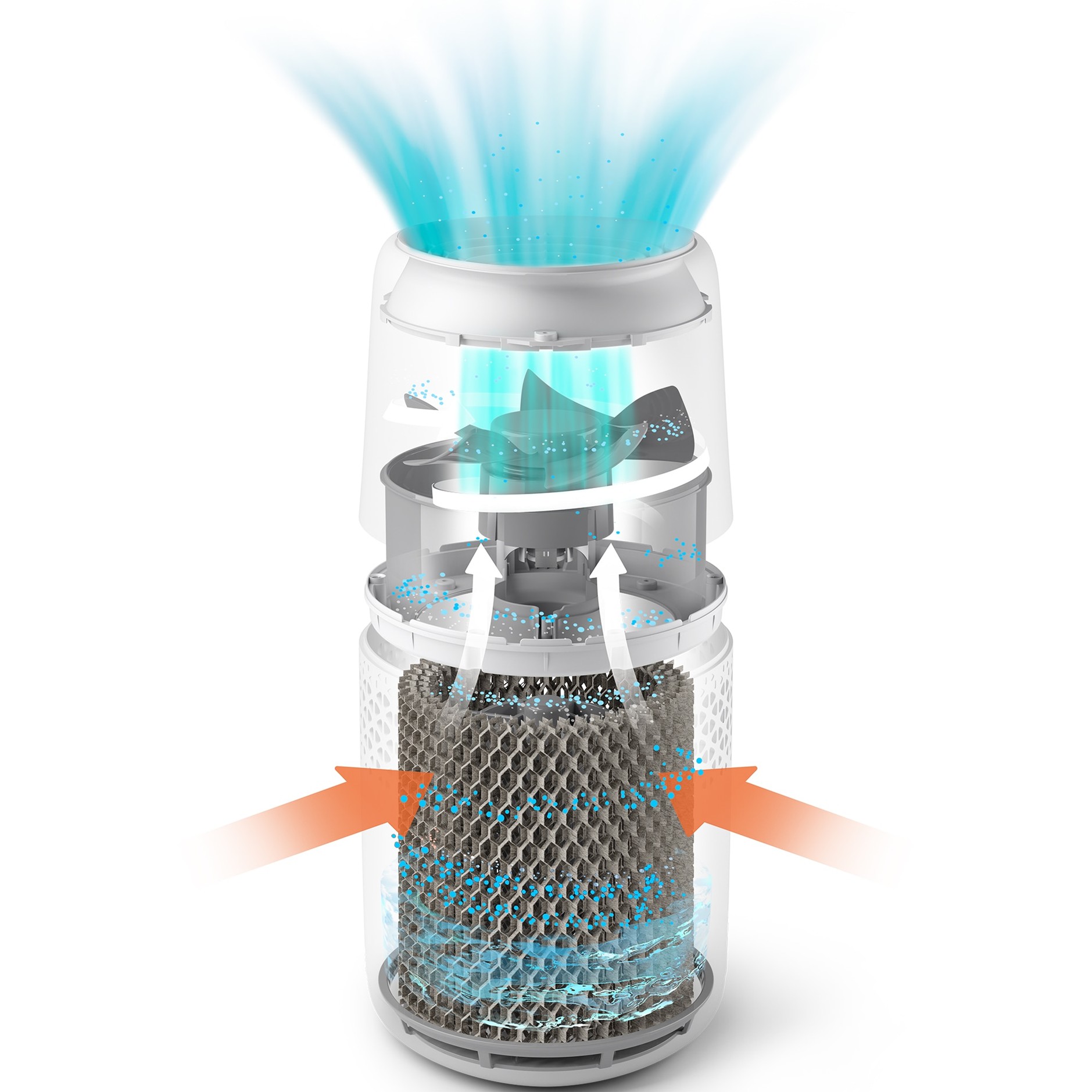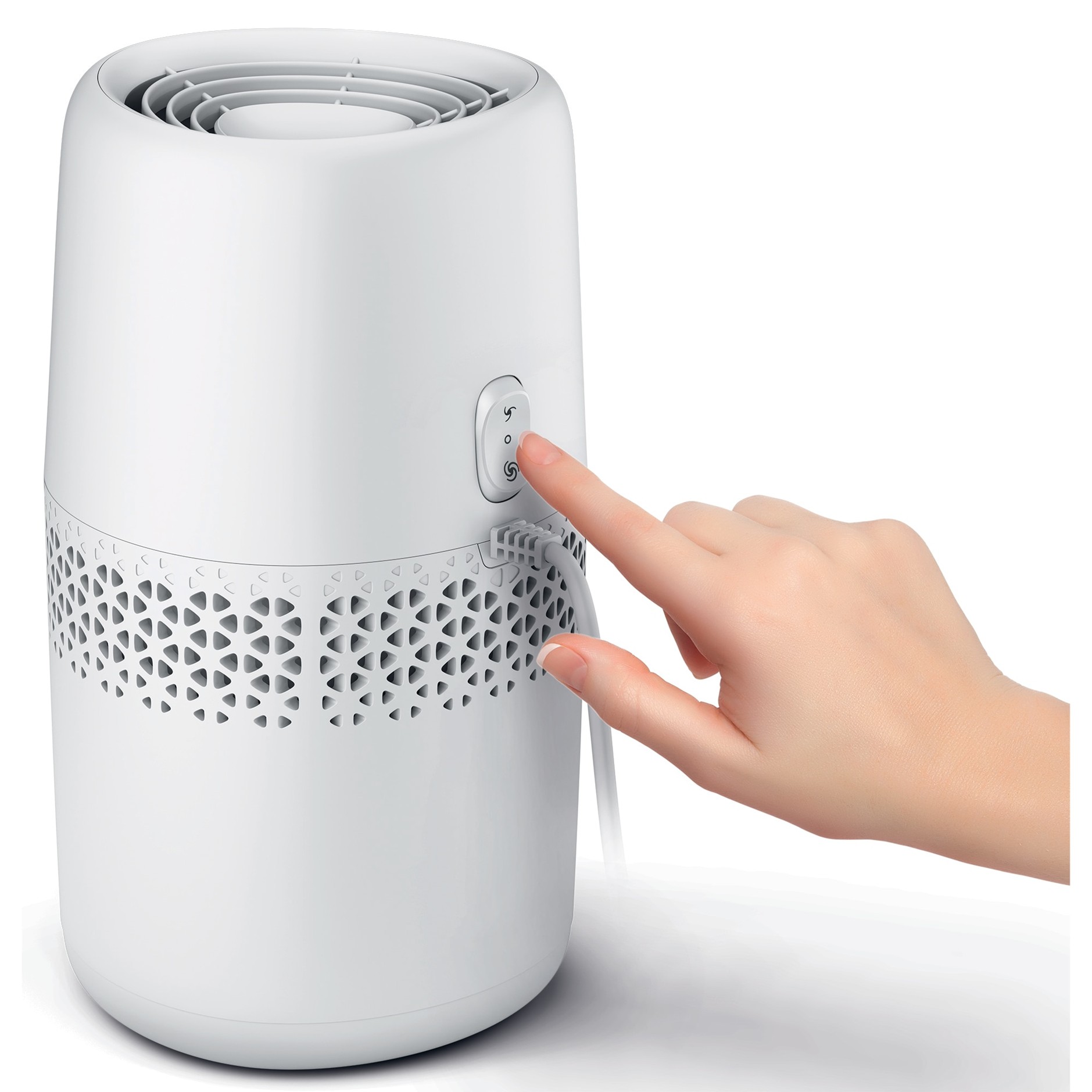 Овлажнителят консумира само до 10 W, еквивалентно на LED крушка, което го прави енергоспестяващ. Режимът с намален интензитет работи тихо, само с 32 dB(A), за спокоен сън през нощта, а 2 скорости на вентилатора осигуряват комфорт и ефективност в стаи до 31 m².