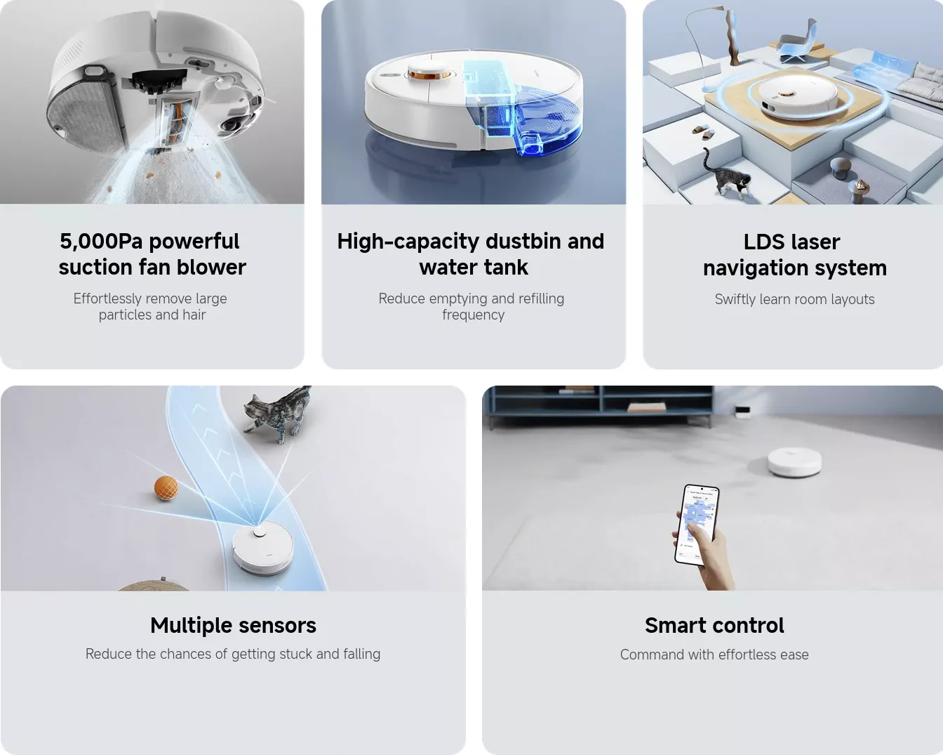 Устройството използва 360° LDS лазерен модул, който изготвя детайлна карта на жилището и настройва оптимални маршрути за почистване. Навигацията разпознава помещения, зони, препятствия и ниви, позволявайки пълна персонализация чрез приложението Xiaomi Home. Роботът работи ефективно в сложни пространства, където изискването за точност и безопасност е най-значимо.