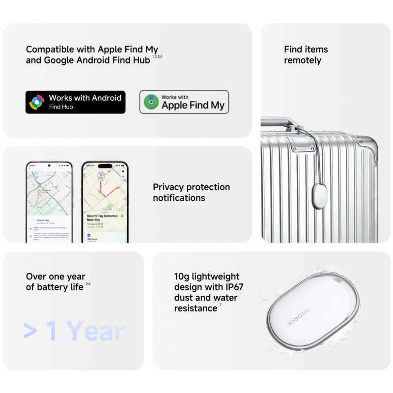 Сертифициран с IP67 защита, Xiaomi Tag е устойчив на прах и вода. Това го прави подходящ за използване при различни условия, без притеснение за повреда.