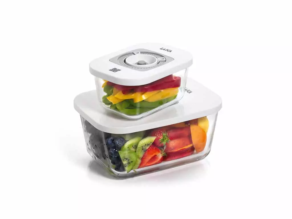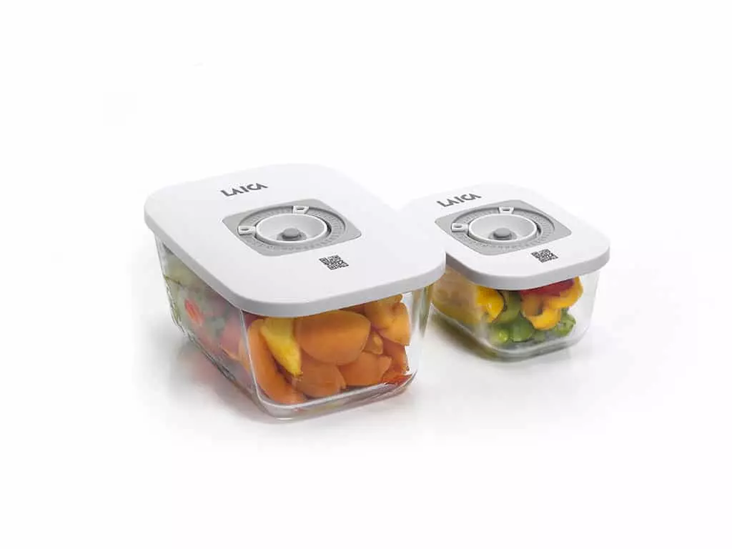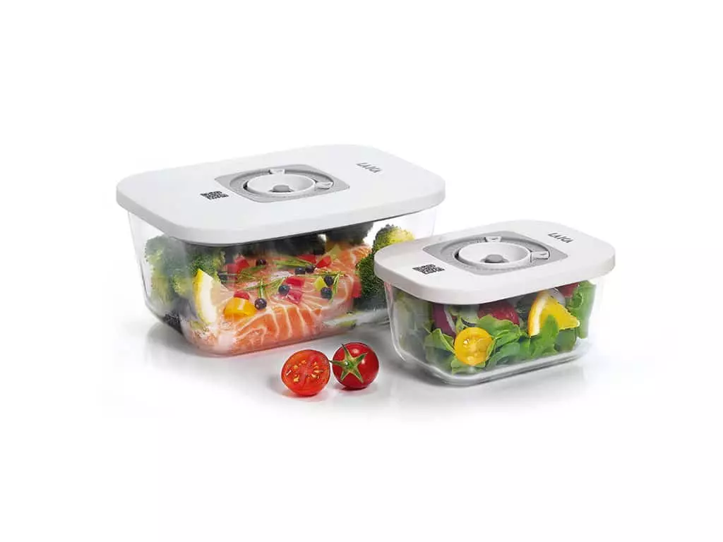 Комплектът Laica VT3306 включва два стъклени съда за вакуумиране, създадени за по-ефективно съхранение на различни хранителни продукти. Благодарение на вакуумното запечатване храната може да запази свежестта си до 4 пъти по-дълго, което помага за по-добра организация в кухнята и намаляване на изхвърлените продукти.
