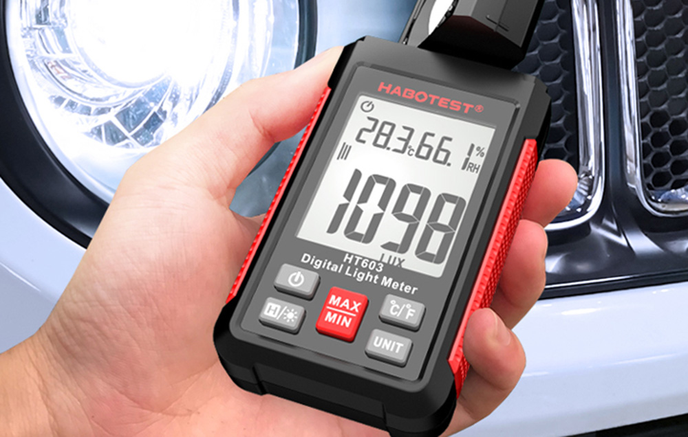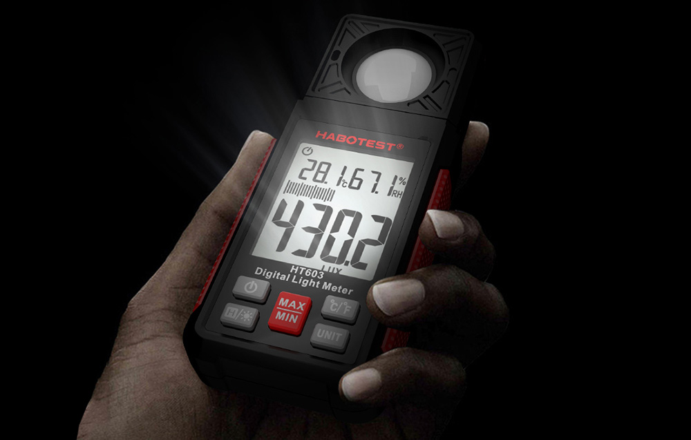 Habotest HT603 е дигитален луксомер, създаден за точно измерване на светлинния интензитет в диапазона от 0 до 100 000 lux или 0 до 10 000 foot-candles. Той е идеален за електротехнически дейности, фотография, инспекция на работни помещения и оптимизиране на осветлението в дома и офиса.