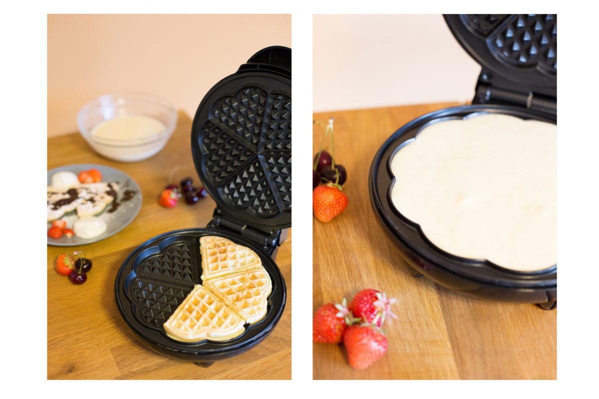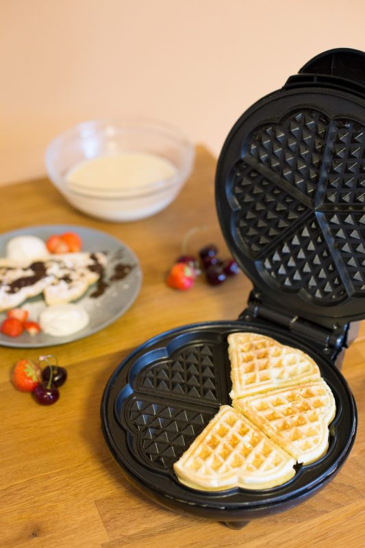 Уредът е оборудван със специални незалепващи плочи с форма на детелина, предназначени за гофрети с диаметър 18 cm. Те гарантират лесно изваждане на готовите гофрети и бързо почистване след употреба.
