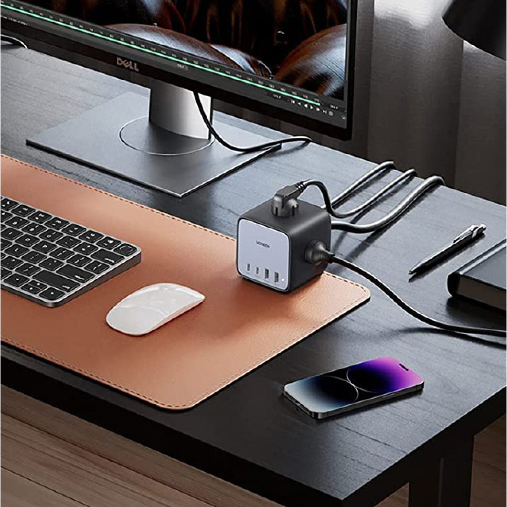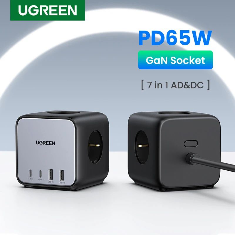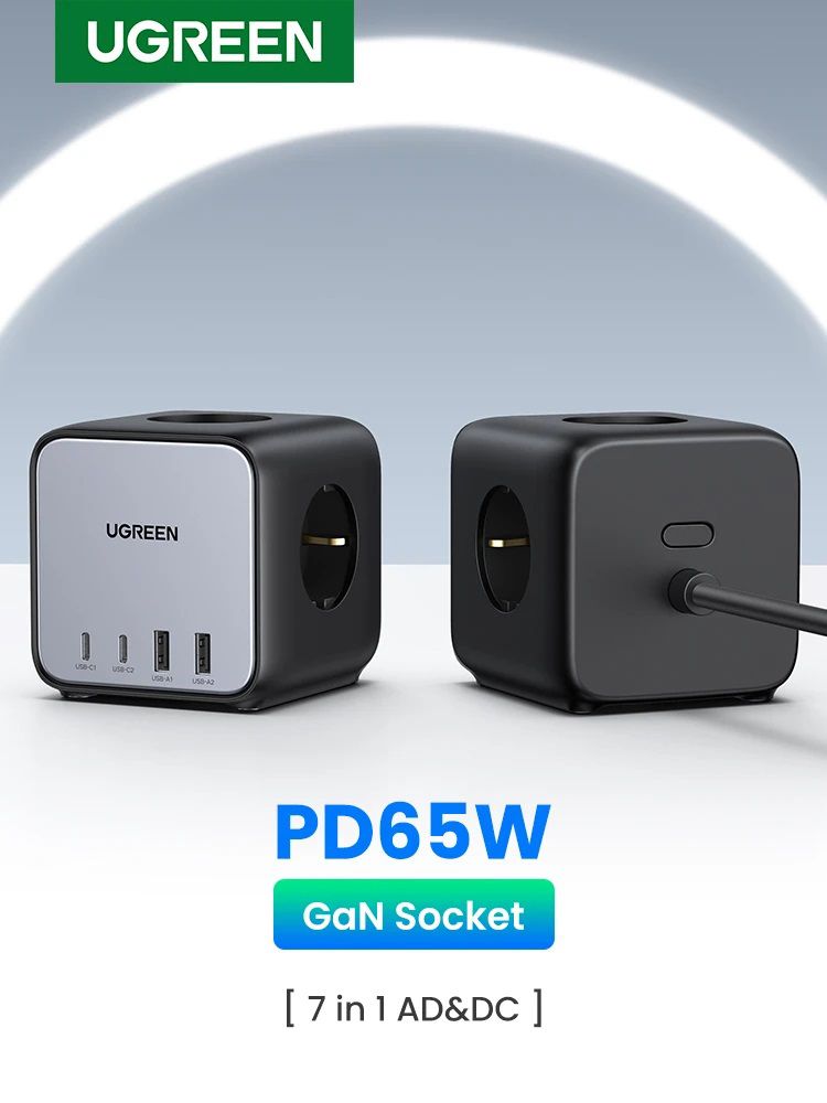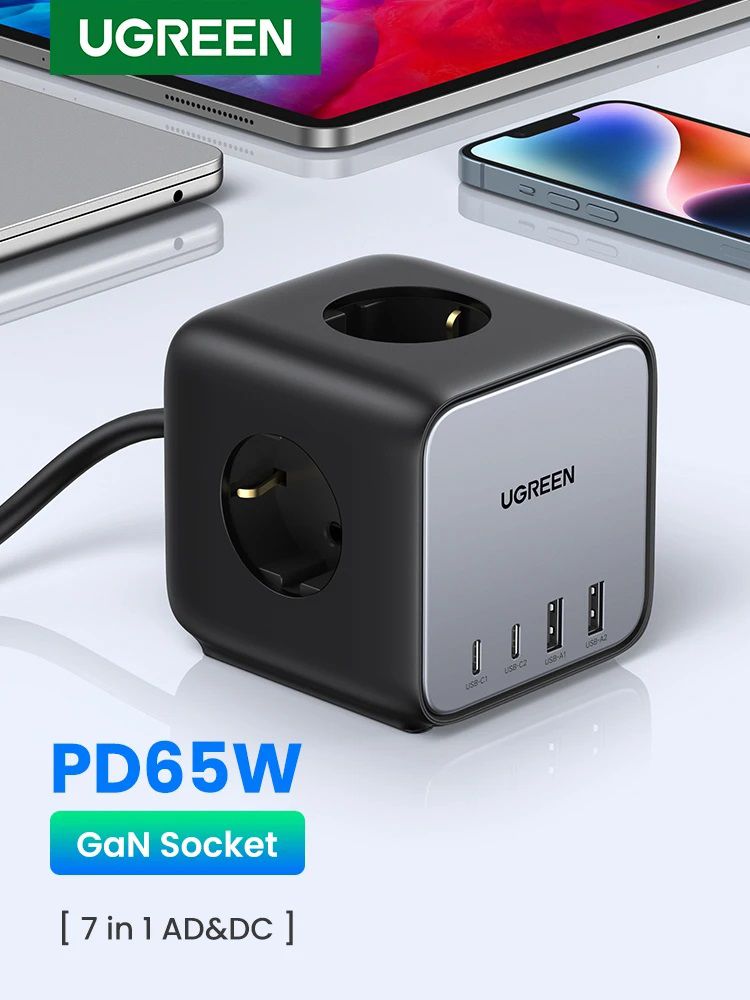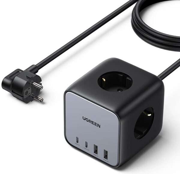 Ugreen DigiNest Cube GaN е модерно многофункционално зарядно устройство, създадено да осигури удобно захранване на няколко електронни устройства едновременно. Комбинацията от USB-A, USB-C портове и три стандартни електрически гнезда Schuko позволява едновременно включване и зареждане на лаптопи, смартфони, таблети и периферни устройства в едно компактно решение.
