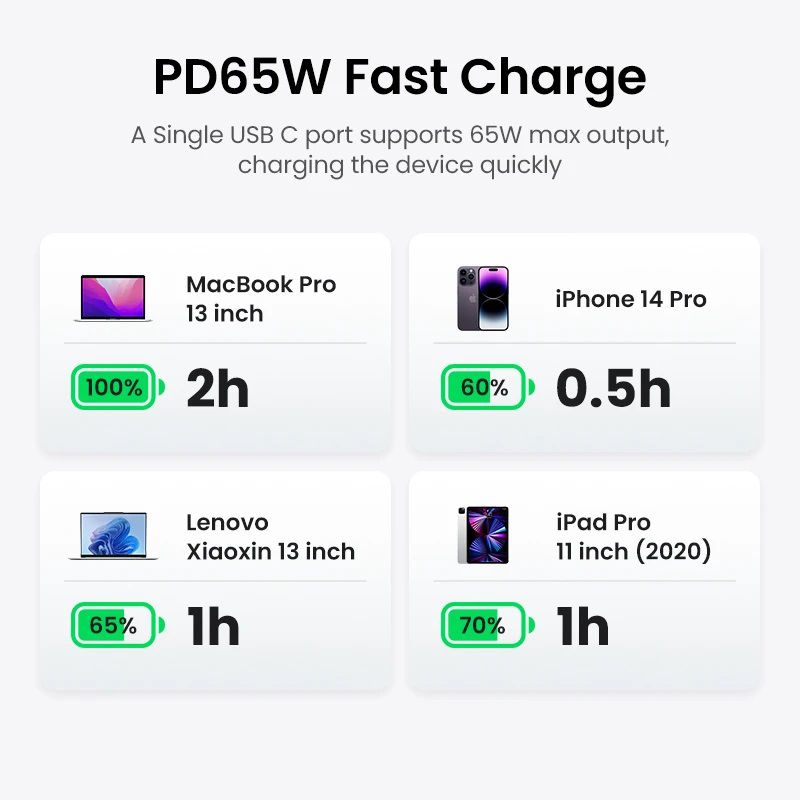 Зарядното поддържа технология Power Delivery 3.0 с максимална мощност до 65W, което го прави подходящо дори за лаптопи като MacBook Pro. Високата изходна мощност позволява значително по-кратко време за зареждане, като в много случаи пълното възстановяване на батерията отнема само около два часа.