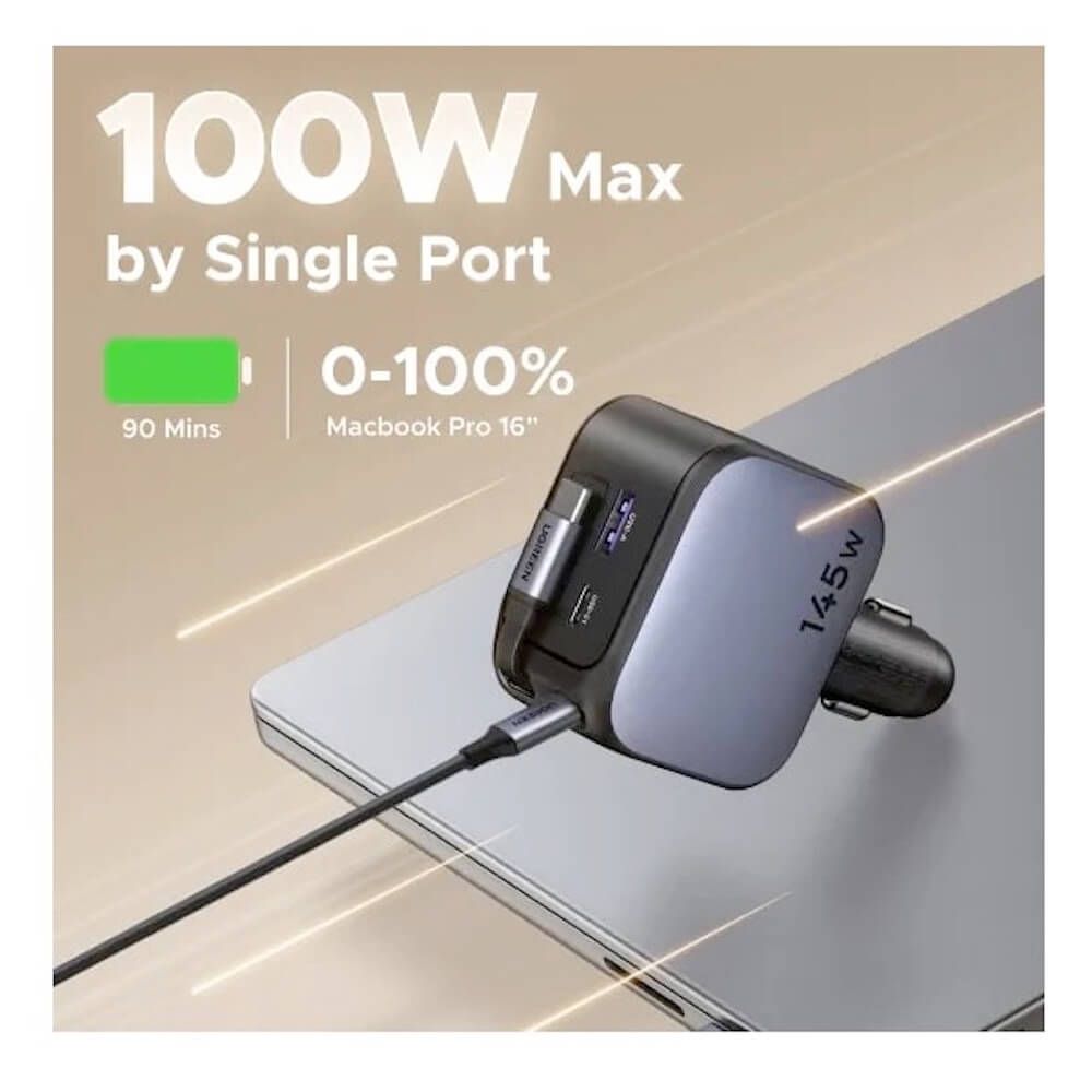 Ugreen EC604 е мощно автомобилно зарядно с обща мощност 145W и възможност за зареждане на три устройства едновременно. Интелигентната технология и поддръжката до 100W го правят подходящо за смартфони, таблети и лаптопи.